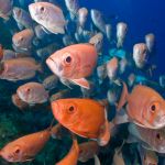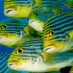 Malaysia. A shrimp cleaning the mouth of a batfish on the house reef, at the popular resort of Kapalai in the Sabah province of Borneo.